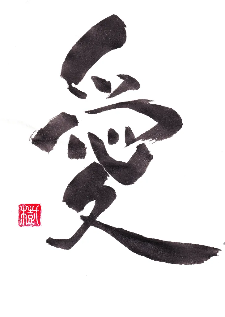It expresses not only romantic love, but also the bond between parents and children, friendship, and compassion for all people. In Japanese calligraphy, "Ai" is a very popular character because of its beautiful balance and the "heart" at its center.